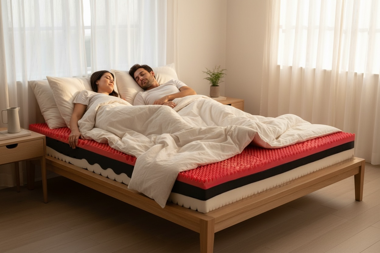 Lo strato superiore in Memory Foam si modella delicatamente al corpo sfruttando il calore naturale della persona, riducendo i punti di pressione su spalle, schiena e fianchi. Questo permette una distribuzione uniforme del peso e favorisce un relax muscolare ottimale durante tutta la notte.